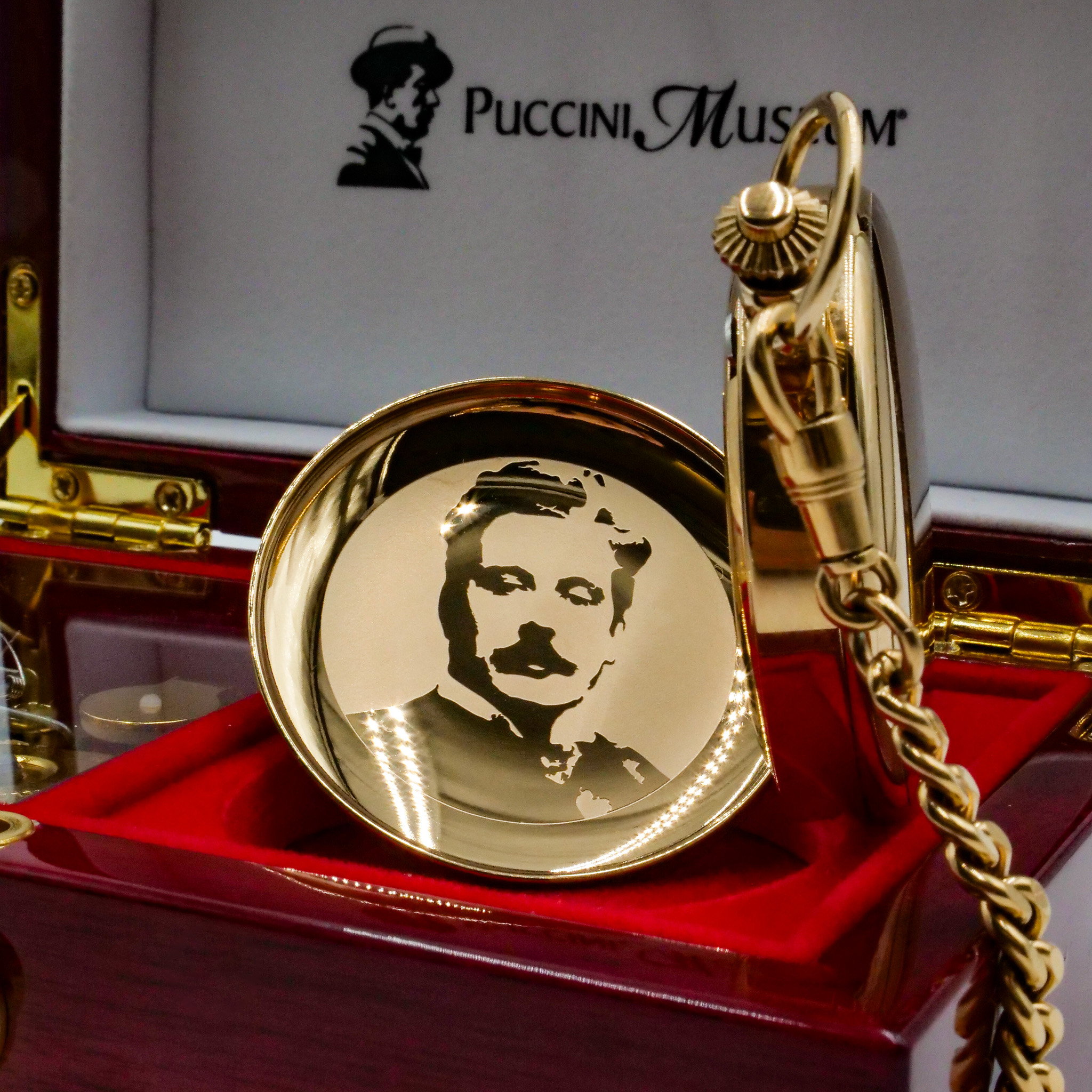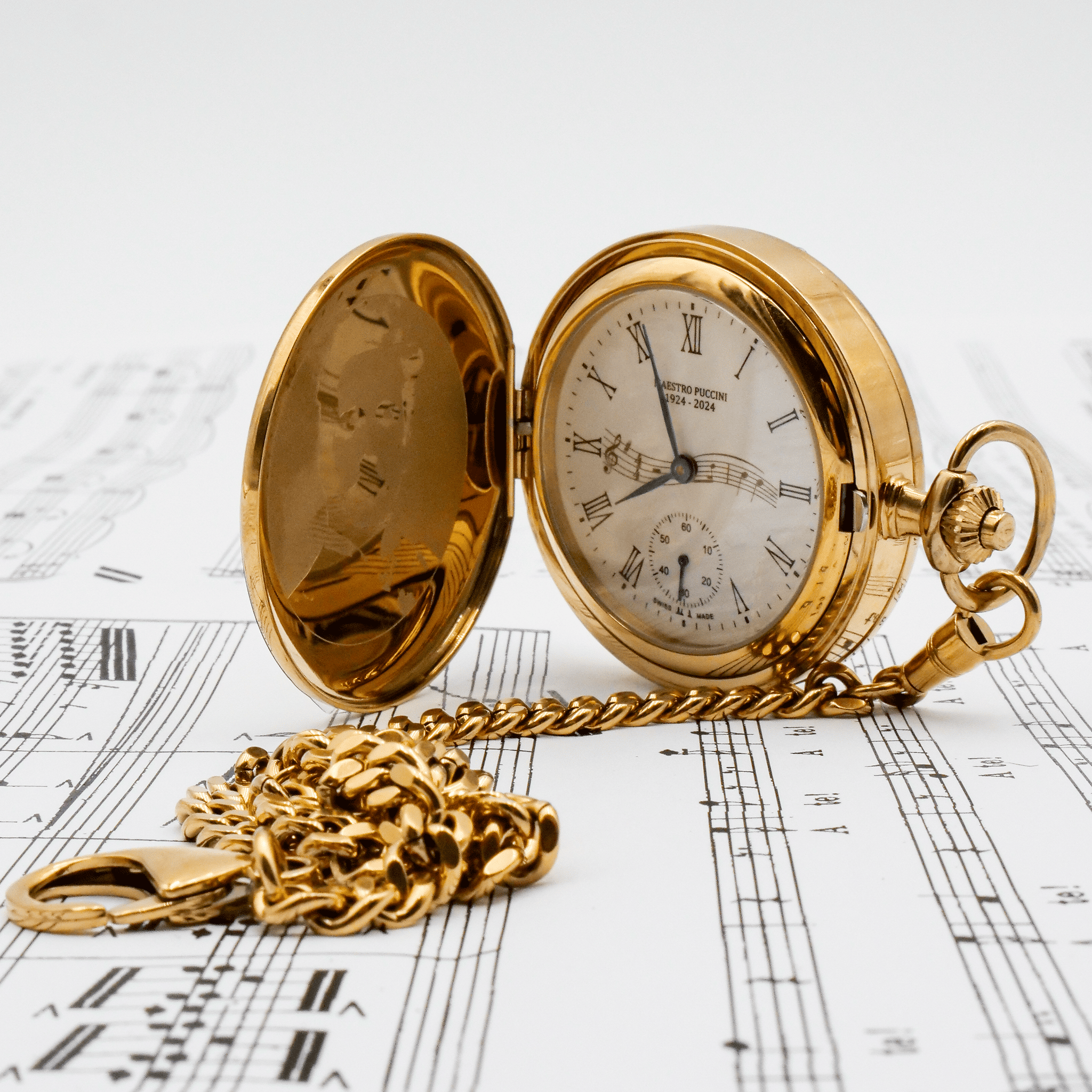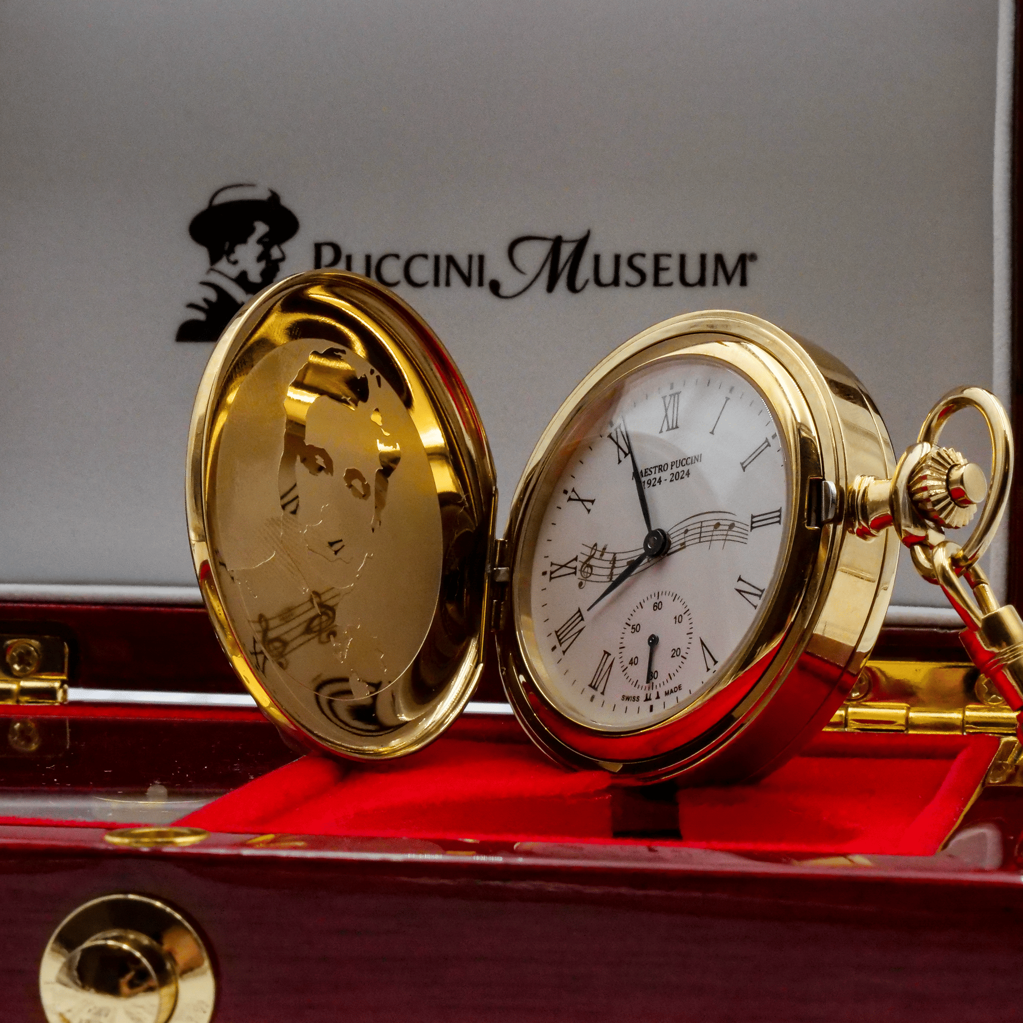 L’orologio si apre da entrambe le parti: da un lato mostra l’incisione del volto di Giacomo Puccini, dall’altro rivela il meccanismo a ricarica manuale dell’orologio, permettendo di ammirare la precisione artigianale del movimento. La ricarica avviene tramite la corona, mentre il fondello si apre con un semplice doppio clic sul pulsante integrato.