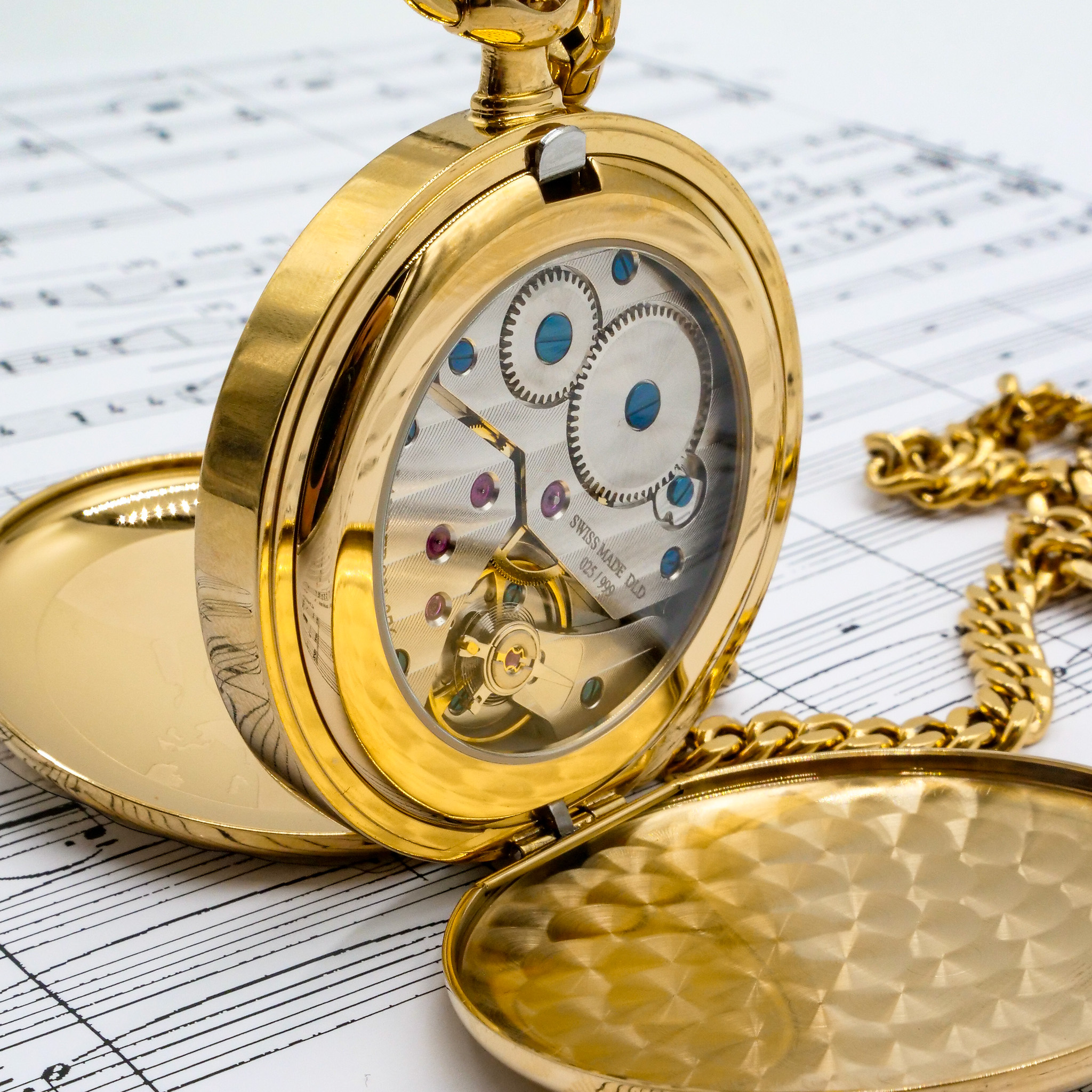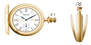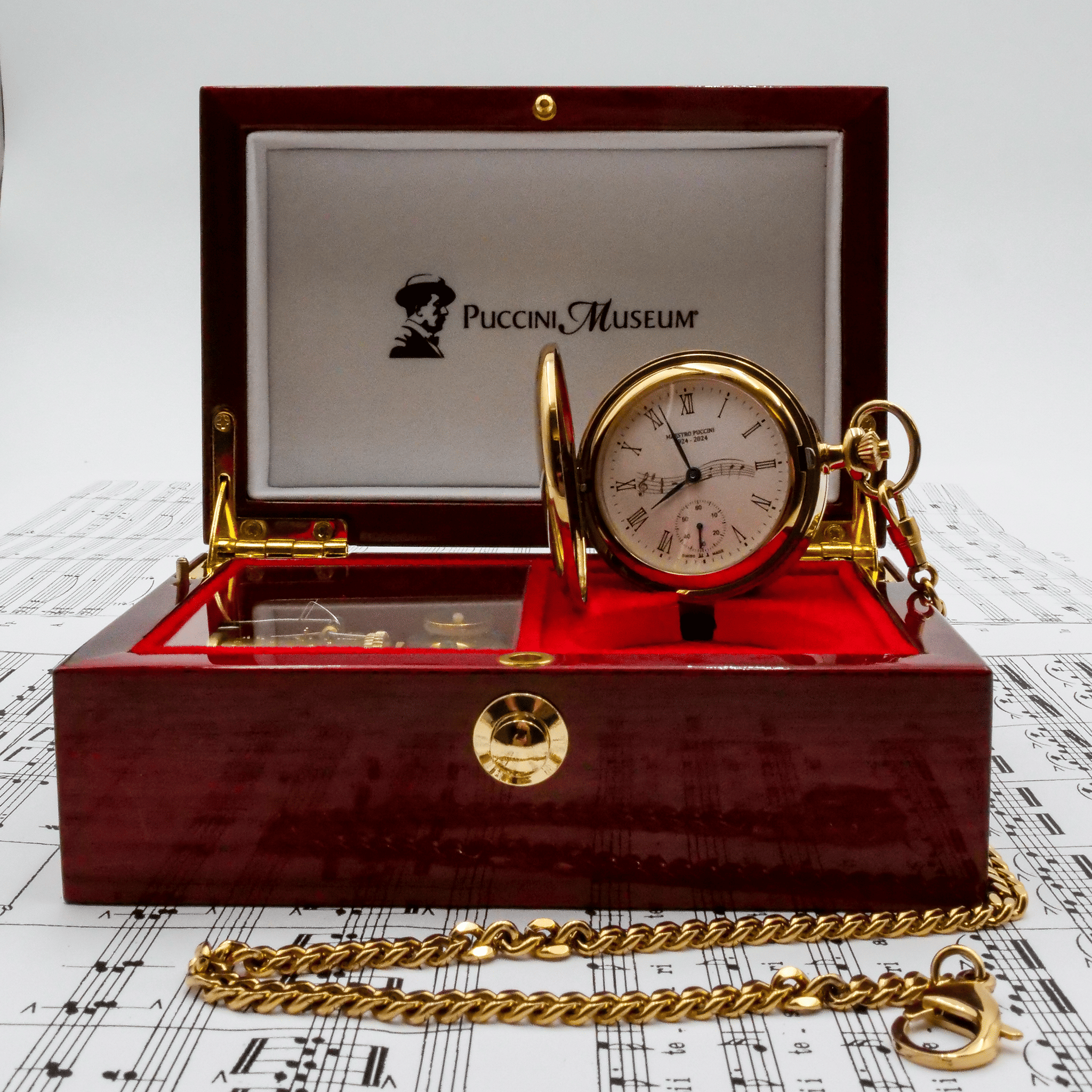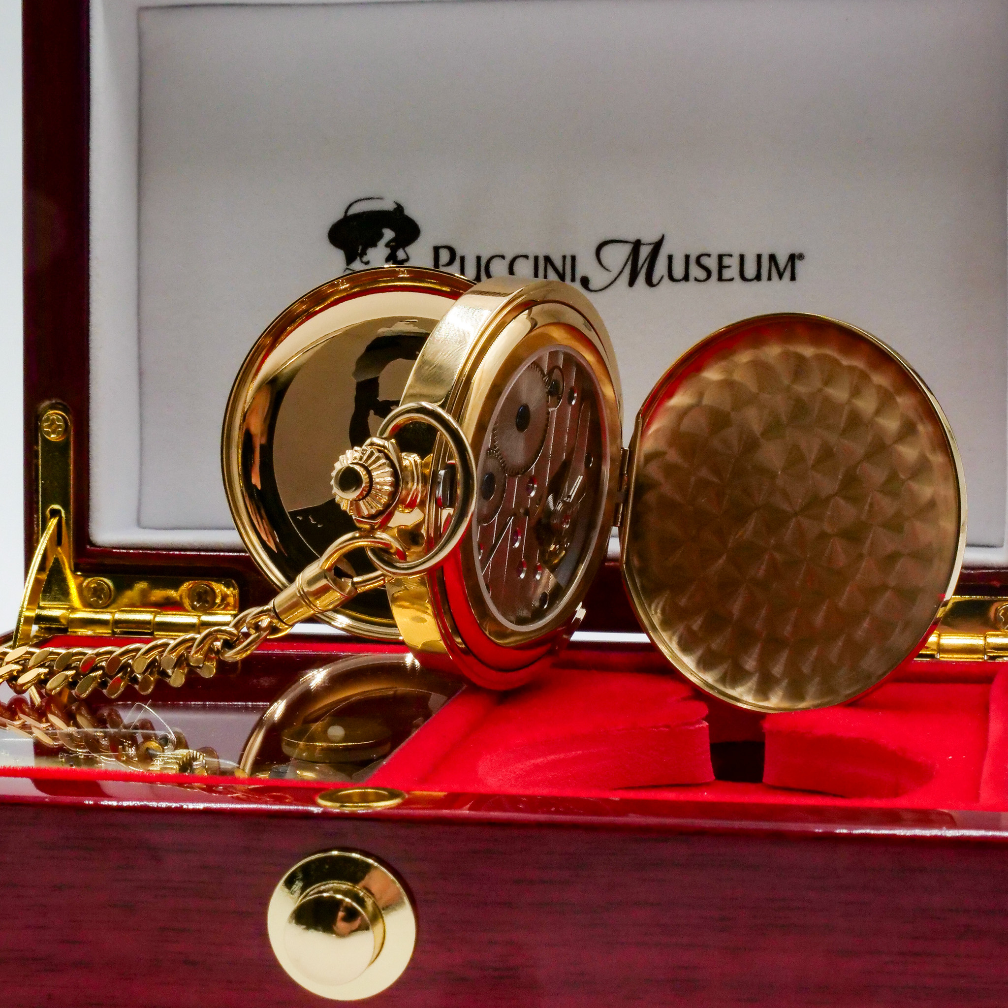 L’orologio si apre da entrambe le parti: da un lato mostra l’incisione del volto di Giacomo Puccini, dall’altro rivela il meccanismo a ricarica manuale dell’orologio, permettendo di ammirare la precisione artigianale del movimento. La ricarica avviene tramite la corona, mentre il fondello si apre con un semplice doppio clic sul pulsante integrato.